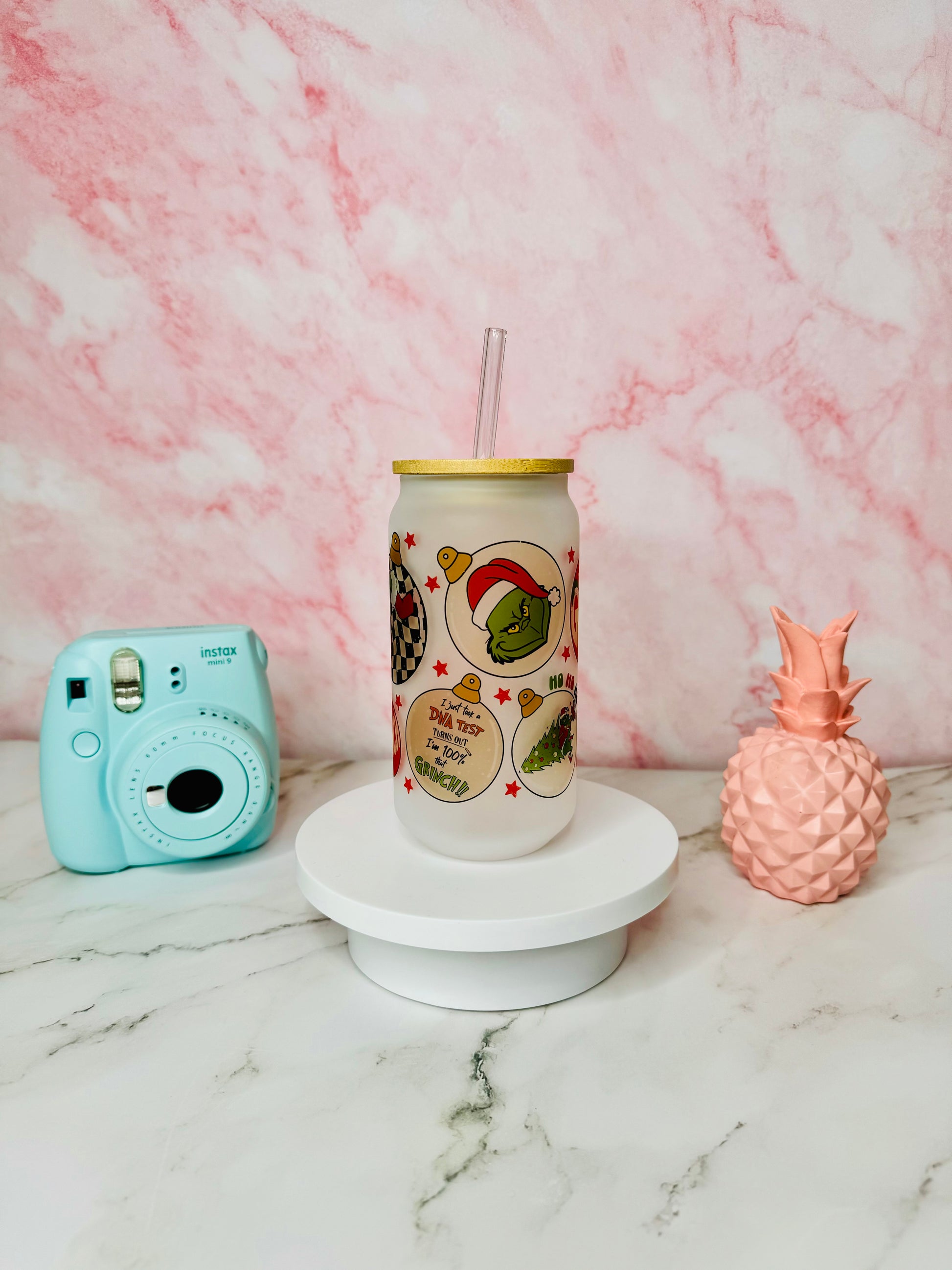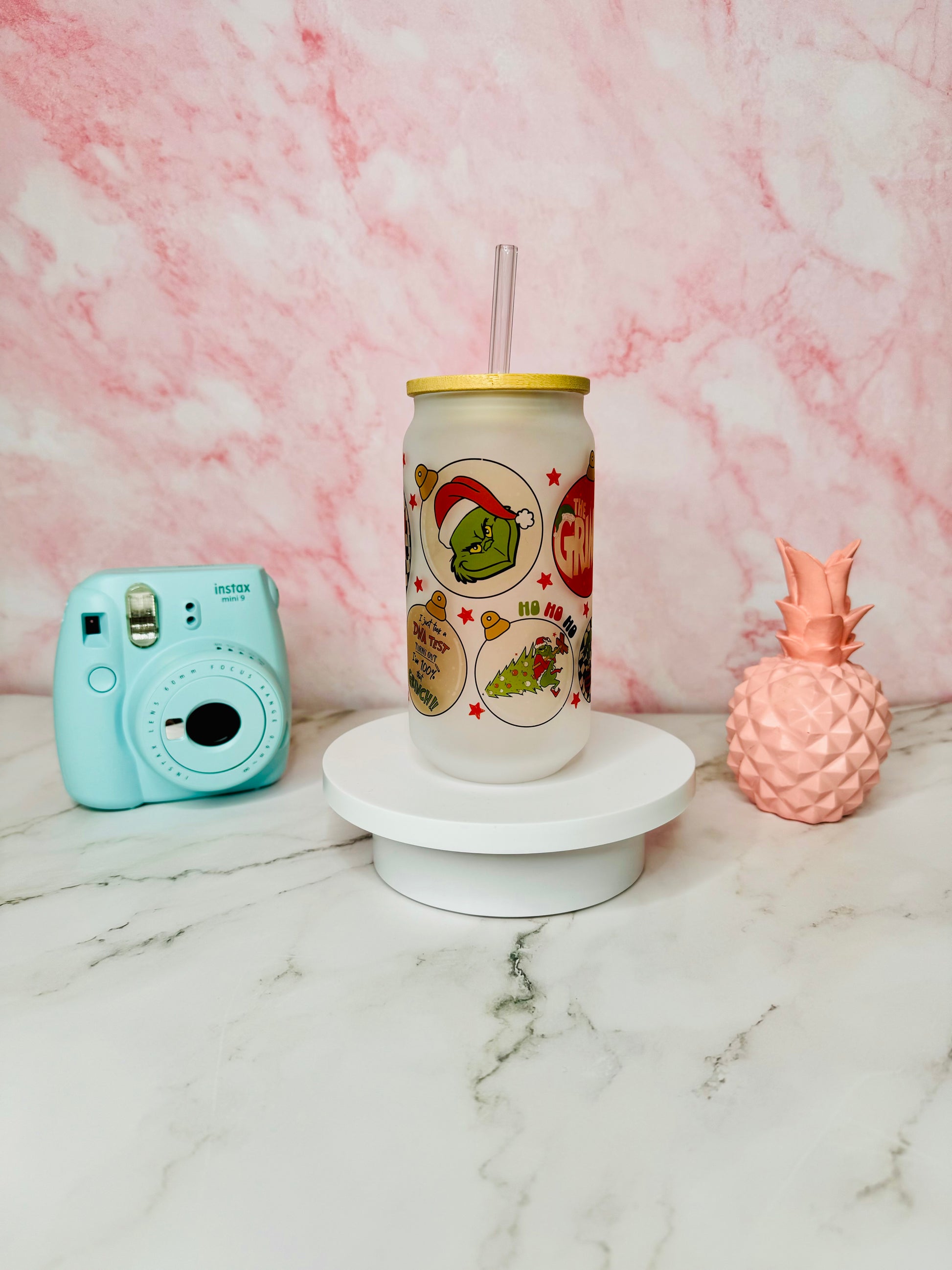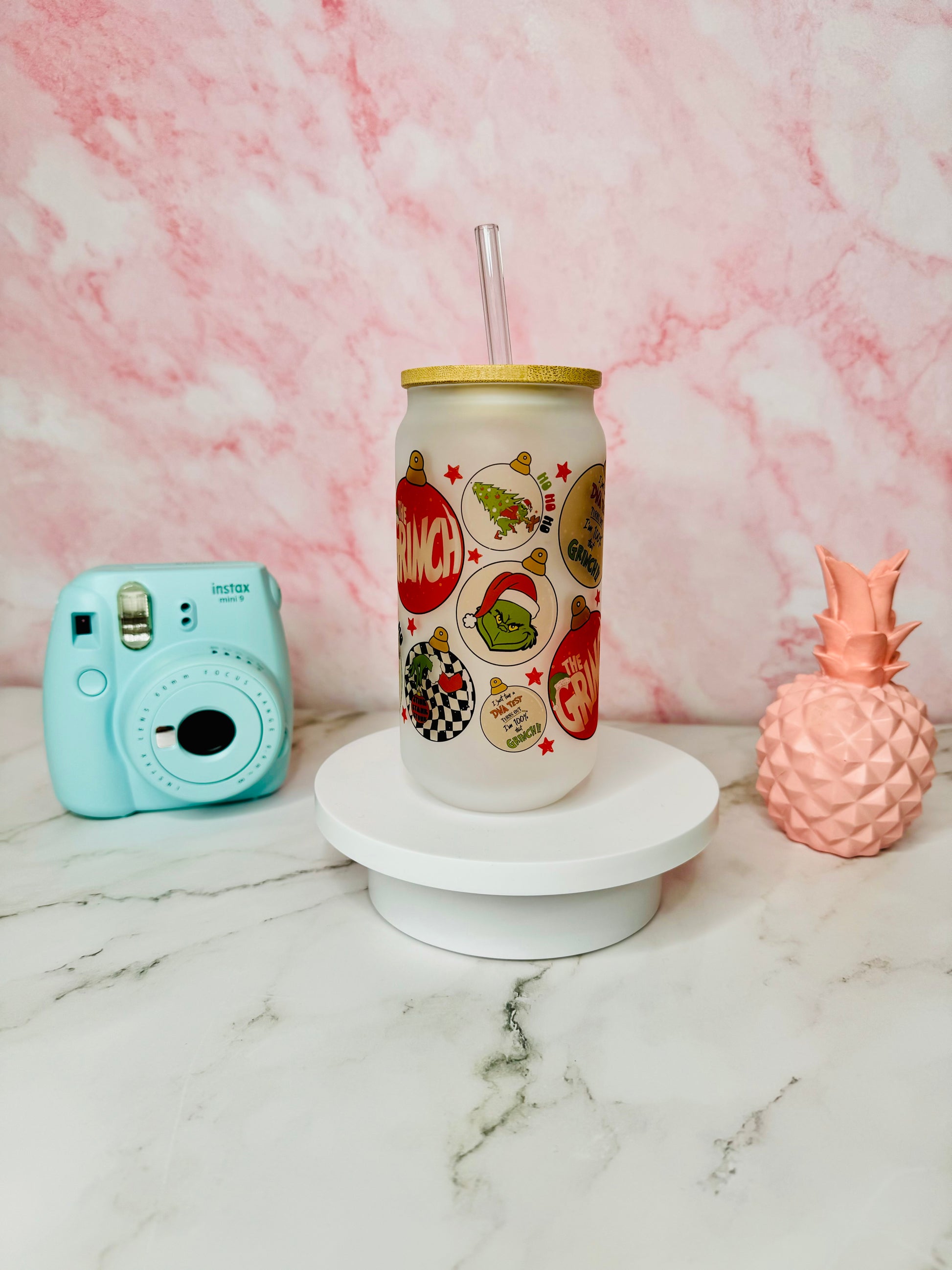 * This can-style glass cup is decorated with a cute Grinchmas Ornaments. It is perfect for cold beverages like iced coffee, beer, soda, cocktails and other refreshers. Great gifts for friends, family, coworkers, and yourself!
